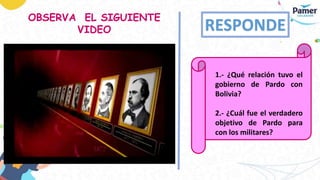 El documento resume el gobierno de Manuel Pardo y Lavalle en Perú desde 1872 hasta 1876, conocido como la República Práctica. Pardo buscó consolidar el poder civil sobre los militares y diversificar la economía más allá de la exportación de guano. Implementó reformas educativas, ferroviarias y tributarias. También firmó un pacto de defensa mutua con Bolivia ante las amenazas de Chile e Inglaterra, y derrotó la rebelión liderada por Nicolás de Piérola conocida como la Expedición El Talismán.