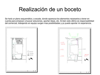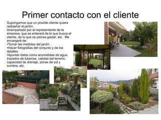 El documento describe las etapas iniciales de contacto con un cliente potencial para rediseñar su jardín. Estas etapas incluyen tomar medidas y fotografías del jardín existente, recopilar datos relevantes, crear un boceto esquemático a escala, desarrollar propuestas formales para presentar al cliente, y utilizar fotomontajes para mostrar el estado actual y la solución propuesta.