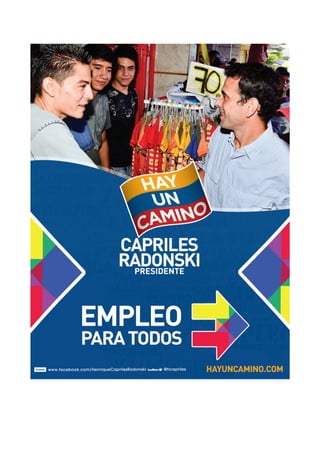 El documento describe un plan para crear empleos para jóvenes en Venezuela. El plan tiene como objetivo crear 900,000 empleos en 6 años para personas entre 15 y 24 años a través de programas de capacitación, incentivos para empresas para contratar jóvenes, y apoyo al emprendimiento juvenil. El plan se implementará en 5 pasos que incluyen formación, capacitación técnica, adquisición de habilidades blandas, incentivos fiscales para empresas, y un programa para fomentar pequeñas empresas creadas por jóvenes.