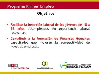 Este documento describe un programa para facilitar la inserción laboral de jóvenes desempleados de 18 a 26 años a través de becas de capacitación, pasantías o contratos de trabajo. El programa ofrece mayores montos de beneficios, plazos extendidos y cupos de beneficiarios según el tamaño de la empresa. A cambio, las empresas deben cumplir condiciones como no realizar despidos ni sustituir trabajadores.