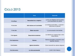 Este documento presenta una serie de encuentros y reflexiones para padres sobre cómo transmitir valores a los hijos. Incluye temas como la necesidad de establecer objetivos claros, los anti-valores en la sociedad, cómo desarrollar los talentos de los hijos, y valores principales como el amor, la dignidad y la libertad. También cubre cómo transmitir valores religiosos y la importancia de vivir en familia.