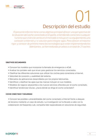 Este documento resume los resultados de un estudio anual sobre coches conectados patrocinado por una empresa y realizado por otra. El estudio analizó los sistemas de conectividad de 21 modelos de 15 marcas diferentes para ofrecer una perspectiva de la situación actual del coche conectado en España.