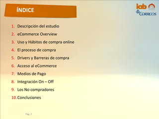 Este estudio analiza el comportamiento de los compradores online en España. Identifica cuatro tipologías de compradores (puros online, tradicionales offline, de tecnología y heavies) y describe sus características demográficas y categorías preferidas. Además, analiza factores como la frecuencia de compra, dispositivos utilizados y experiencias de compra en redes sociales.