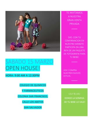 Se invita a una venta privada el sábado 15 de marzo de 9:00 am a 12:30 pm en el Colegio de Químicos y Farmacéuticos en Colonia San Francisco, Calle Los Abetos en San Salvador, donde habrá nuevos estilos y la oportunidad de ganar un paquete de fotografía para bebés al confirmar asistencia en su página web.