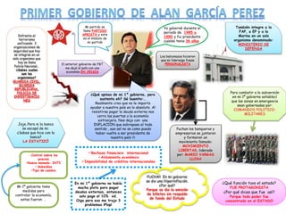 El documento resume el primer gobierno del expresidente peruano Alan García Pérez de 1985 a 1990. Consolidó tres organismos de seguridad en la Policía Nacional, integró las fuerzas armadas en el Ministerio de Defensa, y estableció comandos político-militares para combatir la subversión. Su gobierno se caracterizó por un fuerte protagonismo del estado, la estatización de la banca, y medidas como controles de precios e inflación que llevaron a una hiperinflación. Solo pagó el 10% de la deuda externa