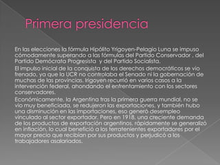 La fórmula de Hipólito Yrigoyen y Pelagio Luna del partido Unión Cívica Radical ganó las elecciones de 1916. Sin embargo, el impulso democrático inicial se vio frenado porque la UCR no controlaba el Senado ni muchas provincias. Económicamente, la Argentina no se benefició mucho de la Primera Guerra Mundial y hubo desempleo e inflación. Durante la presidencia de Yrigoyen ocurrió la rebelión de trabajadores en Santa Cruz, que fue reprimida por el ejército con