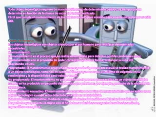 El documento describe la importancia del mantenimiento de objetos tecnológicos como computadoras, aires acondicionados y autos para prolongar su vida útil mediante la detección y corrección de problemas. Se detallan los tipos de mantenimiento programado, no programado, correctivo y sintomático, así como ejemplos específicos del mantenimiento requerido para estos objetos como limpieza de filtros, revisión de circuitos eléctricos y cambio de aceite.