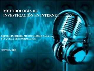 Este documento presenta una metodología para realizar la búsqueda de información en Internet para un proyecto de investigación sobre las emisoras universitarias UN Radio y Laúd Estéreo de Colombia. La metodología incluye identificar palabras clave y conceptos en el Tesauro de la UNESCO, revisar bases de datos y motores de búsqueda relevantes, y hacer seguimiento a páginas web institucionales a través de RSS para mantenerse actualizado sobre la información nueva. El objetivo es encontrar libros, artículos, document