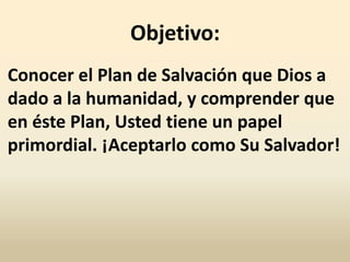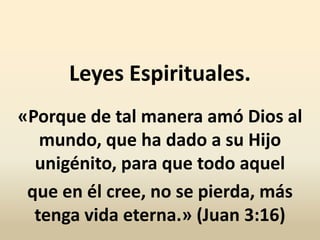 El documento resume las Leyes Espirituales de Dios. Explica que Dios ama al mundo y dio a su Hijo Único, Jesucristo, para que todo aquel que crea en él tenga vida eterna. Insta al lector a aceptar a Jesús como su Salvador para beneficiarse del plan maravilloso que Dios tiene para su vida y recibir la promesa de la vida eterna.
