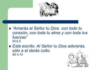 El documento resume los principales aspectos del Primer Mandamiento desde una perspectiva católica. Explica que este mandamiento llama a creer en Dios, esperar en él y amarlo con todo el ser. También describe las virtudes teológicas de fe, esperanza y caridad y los pecados contra cada una. Finalmente, analiza otros mandamientos como no tener otros dioses y no hacer imágenes, así como también discute la idolatría, superstición y ateísmo.