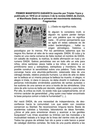 El primer manifiesto dadaísta declara que Dada no significa nada y que no debe construirse una sensibilidad sobre una sola palabra. Rechaza que el arte deba ser bello o divertido, y afirma que la crítica es subjetiva. Explica que Dada nació de la necesidad de independencia y desconfianza hacia la comunidad. Rechaza las teorías y academias existentes, y pregunta si el arte solo sirve para enriquecer a los burgueses.