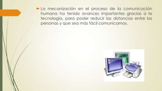 Este documento presenta información sobre periodismo digital. Explica que la tecnología ha permitido avances en la comunicación humana al reducir distancias. También describe los componentes del lenguaje como escrito y auditivo, así como los antecedentes de Internet desde la década de 1960 con redes como Arpanet y TCP/IP. Finalmente, analiza las ventajas y desventajas del periodismo en la web.