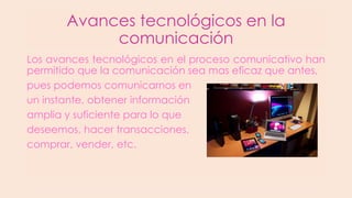 Este documento presenta información sobre varios temas relacionados con la comunicación y el periodismo digital. Explica los avances tecnológicos que han permitido una comunicación más eficaz, como la convergencia mediática y el uso de la tecnología para la comunicación masiva. También describe las herramientas clave de la comunicación como la imprenta, el telégrafo y el teléfono, así como el desarrollo de Internet y las diferencias entre el periodismo digital y tradicional.