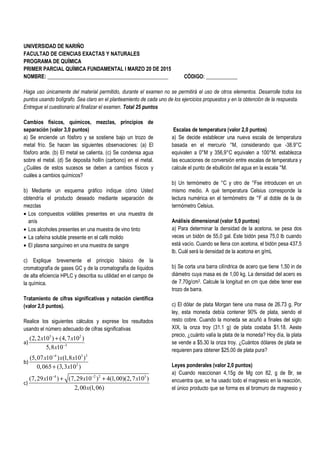 Este documento es un examen de química fundamental I que cubre varios temas incluyendo cambios físicos y químicos, separación de mezclas, tratamiento de cifras significativas, escalas de temperatura, análisis dimensional, leyes ponderales, isotopos, número de Avogadro, átomos e iones, y formulación y nomenclatura. El examen contiene preguntas conceptuales y de cálculo sobre estos temas para evaluar el conocimiento del estudiante.
