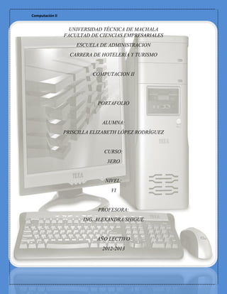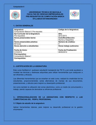 Este documento presenta el syllabus de la asignatura Computación II de la Universidad Técnica de Machala. La asignatura tiene una duración de 60 horas prácticas y busca que los estudiantes aprendan a aplicar herramientas básicas como procesadores de texto, hojas de cálculo y presentaciones para mejorar su desempeño profesional. El syllabus describe los objetivos, competencias, unidades y temas que se cubrirán, incluyendo el uso de correo electrónico, presentaciones y software libre.