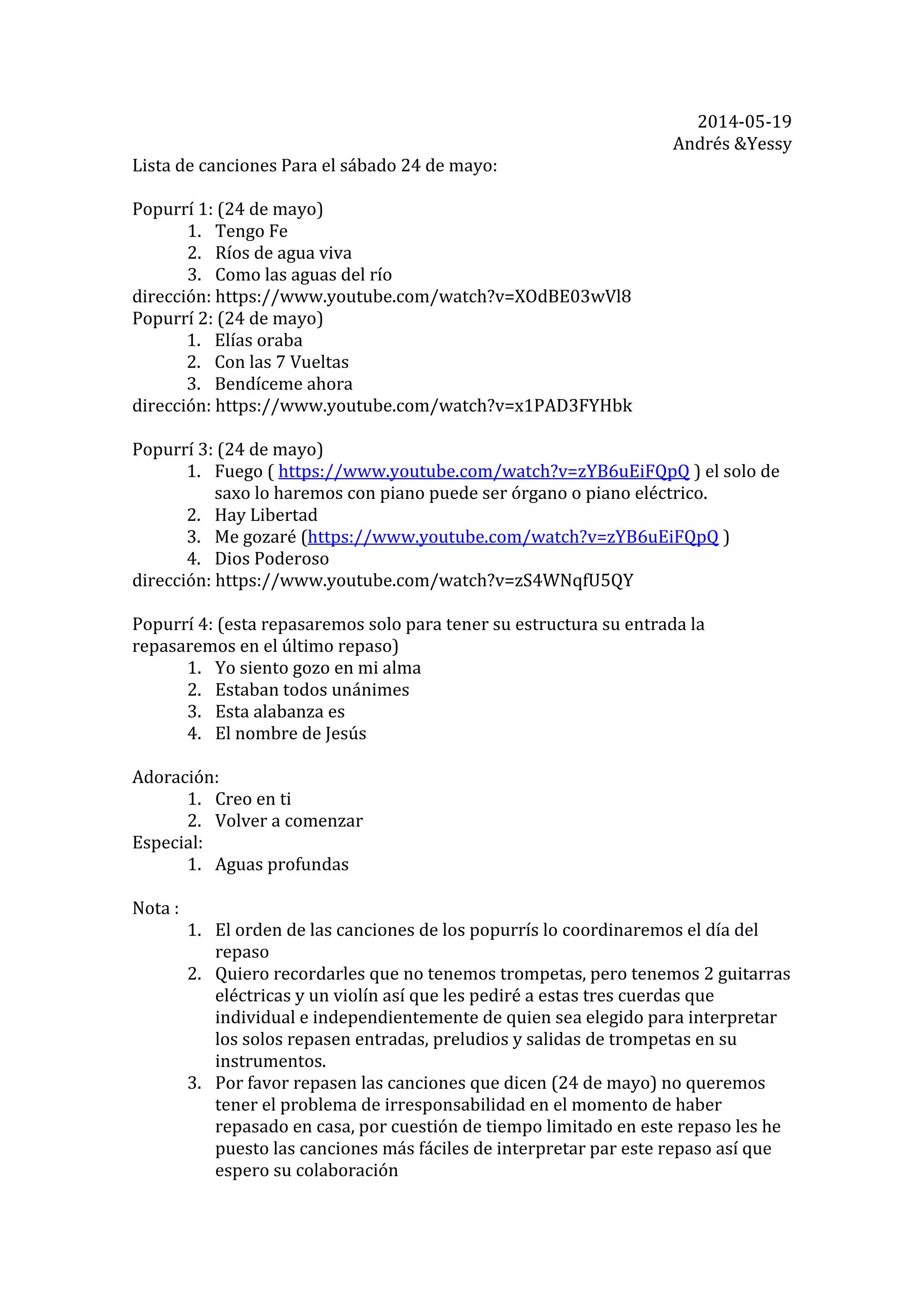 Este documento presenta una lista de canciones y popurrís para un servicio religioso el 24 de mayo. Incluye cuatro popurrís con tres canciones cada uno, dos canciones de adoración, y una canción especial. También proporciona enlaces de YouTube e instrucciones para los músicos sobre el orden de las canciones y la interpretación de solos originalmente para trompeta en otros instrumentos debido a la falta de trompetas.