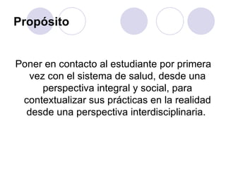 Este documento presenta la materia BIOTEC 2012. Tiene como propósito poner al estudiante en contacto por primera vez con el sistema de salud desde una perspectiva integral y social. Los objetivos incluyen favorecer la inserción de los estudiantes en el sistema de salud de manera interdisciplinaria. La metodología incluye evaluación continua, conferencias, talleres y prácticas integradoras en efectores de salud. Se detallan los contenidos, requisitos y estructura de la materia.
