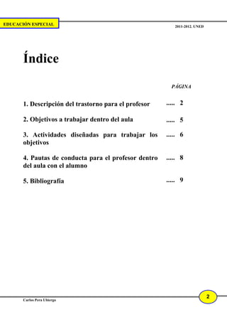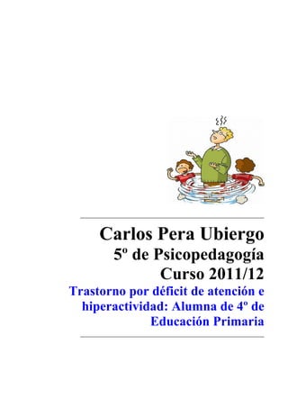 Este documento proporciona una descripción del trastorno por déficit de atención e hiperactividad (TDAH) para profesores. Explica que el TDAH se caracteriza por síntomas de desatención, hiperactividad e impulsividad. También describe brevemente las causas neurobiológicas del trastorno y los síntomas específicos que un profesor podría observar en un estudiante con TDAH, como dificultad para prestar atención, terminar tareas o permanecer quieto. El objetivo es