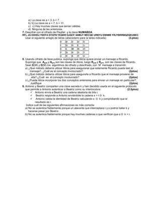 Este documento presenta una práctica calificada de un curso de métodos criptográficos de protección de la información. Contiene 9 preguntas sobre conceptos criptográficos como clasificación de criptosistemas, cifrado de Vigenere, sustitución monoalfabética, cifrado de Playfair y clave pública. Se pide al estudiante resolver las preguntas en un cuadernillo de acuerdo a las instrucciones provistas.