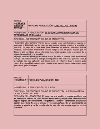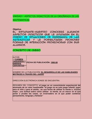 Este documento presenta varios conceptos relacionados con la enseñanza de las matemáticas, incluyendo el juego, el aprendizaje significativo y las estrategias didácticas. Se definen estos conceptos según varios autores y también según la opinión personal del autor sobre cómo el juego puede motivar a los estudiantes, cómo el aprendizaje significativo ocurre cuando los estudiantes pueden relacionar nueva información con sus conocimientos previos, y cómo las estrategias didácticas deben diseñarse considerando las necesidades de los estudiant