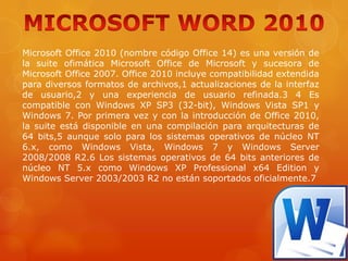 Microsoft Office 2010 es la versión sucesora de Office 2007. Ofrece compatibilidad ampliada con formatos de archivos y mejoras en la interfaz de usuario y experiencia de usuario. Es compatible con Windows XP SP3 de 32 bits, Windows Vista SP1 y Windows 7 de 32 y 64 bits, aunque la versión de 64 bits solo es compatible con sistemas operativos Windows de núcleo NT 6.x.