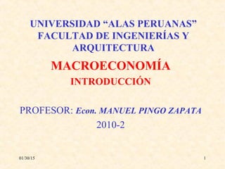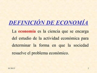 Este documento presenta una introducción a la macroeconomía. Define la economía y explica que la macroeconomía estudia los efectos agregados de las decisiones individuales, de las empresas y los gobiernos en la economía nacional y global. Describe los componentes de la macroeconomía como la contabilidad social, el análisis macroeconómico, la política económica y sus objetivos e instrumentos. Finalmente, explica conceptos clave como el método, objeto y división de la macroeconomía.