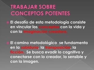 Este documento presenta la metodología de un diplomado sobre prácticas pedagógicas, agenciamientos y gubernamentalidad. El objetivo es vincular conceptos potentes con la vida y la imaginación a través de la sabiduría, la transposición y la ficción para evadir lo cognitivo y conectarse con lo creador. El diplomado busca constituir un equipo diverso que rompa fronteras y comprenda la complejidad de la potencia a través de prácticas innovadoras en instituciones educativas.