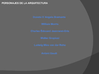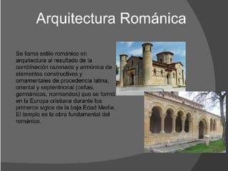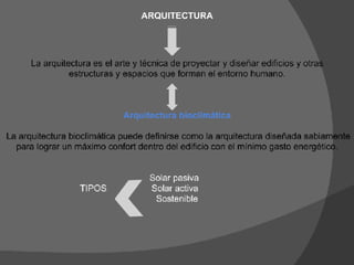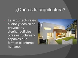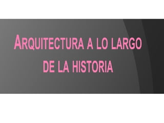 El documento presenta una introducción a la historia de la arquitectura desde las primeras cuevas habitadas por el hombre primitivo hasta las arquitecturas innovadoras actuales, pasando por las grandes civilizaciones antiguas, la arquitectura griega y romana, el desarrollo de estilos medievales como el bizantino y el gótico, el renacimiento, el barroco, el neoclasicismo, el modernismo y la posmodernidad. Se destacan figuras como Vitrubio y corrientes como el funcionalismo.