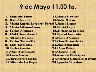 El documento contiene la información práctica sobre la celebración de la Primera Comunión de varios grupos de estudiantes, incluyendo los horarios, la distribución de túnicas, la llegada al colegio, lo que ocurrirá durante la celebración y un donativo para proyectos de caridad.