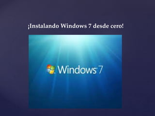 Este documento proporciona instrucciones para instalar Windows 7 desde cero en una computadora. Explica los requisitos necesarios como un CD de Windows 7, procesador de 1 GHz, 1 GB de RAM y 16 GB de espacio en disco duro. A continuación, detalla los 8 pasos para insertar el CD, apagar la computadora con el CD dentro, encenderla y seleccionar la opción de arranque desde el CD para iniciar la instalación siguiendo los pasos en pantalla. También describe varios componentes básicos de una computadora.