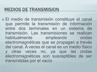 Este documento clasifica y describe los principales medios de transmisión de información, incluyendo medios guiados como cables de par trenzado, coaxiales y fibra óptica, así como medios no guiados como radiofrecuencia, microondas, infrarrojos y luz. Explica las ventajas e inconvenientes de cada uno y sus usos más comunes.