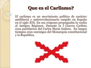 La Primera Guerra Carlista (1833-1840) fue una guerra civil en España entre partidarios del régimen absolutista, que apoyaban a Carlos María Isidoro como rey, y los que apoyaban a Isabel II y su regente María Cristina tras la muerte de Fernando VII. Los carlistas tenían el apoyo de provincias del norte de España mientras que los isabelinos contaban con el apoyo de Reino Unido, Francia y Portugal. Tras éxitos iniciales carlistas, los isabelinos tomaron la iniciativa y la guerra terminó en 1839 con