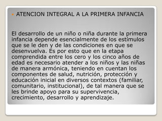 El documento describe la importancia de brindar atención integral a la primera infancia entre los 0 y 5 años a través de estímulos y condiciones que apoyen su supervivencia, crecimiento, desarrollo y aprendizaje. Explica que la Guía 35 del Ministerio de Educación establece directrices para la atención de niños de 3 a 5 años y que el ICBF lidera la estrategia nacional "De Cero a Siempre" para promover el desarrollo infantil temprano a través de un enfoque intersectorial de derechos que