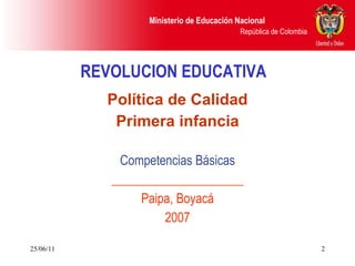 El documento describe las competencias básicas que debe adquirir todo niño en Colombia. Estas incluyen competencias comunicativas, ciudadanas, matemáticas y científicas. Explica que las competencias surgen de las interacciones de los niños y su desarrollo de funciones mentales como la inferencia y la clasificación. También destaca que las competencias solo se pueden evaluar a través del desempeño de los niños al enfrentar situaciones problémicas.