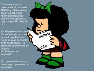 Mafalda experimentó su primera menstruación y, al estar sola en casa, buscó ayuda en su amigo Felipe. Aunque Felipe insistió en que podía ayudarla a pesar de ser un asunto de mujeres, Mafalda se negó a contarle lo que le pasaba. Finalmente, Mafalda le mostró la sangre en su falda y Felipe, horrorizado, pensó erróneamente que se había arrancado los órganos reproductivos masculinos.
