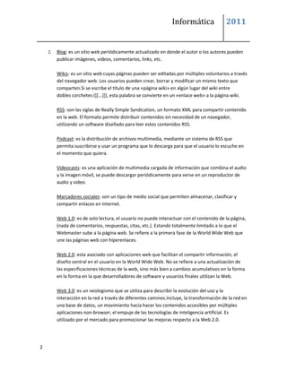 El documento describe diferentes herramientas y tecnologías web como blogs, wikis, RSS, podcasts, videocasts, marcadores sociales, Web 1.0, Web 2.0, Web 3.0 y servicios de Google como Google Docs, Google Traductor y Google Grupos. También describe plataformas educativas como Moodle y herramientas para editar audio, video y imágenes como Audacity, Hypercam y Camtasia.