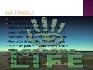 El documento analiza dos software de uso gratuito: Second Life Viewer 2, un mundo virtual 3D donde los usuarios crean avatares, y Física 2000, un simulador web interactivo con animaciones sobre temas de física como rayos X y láseres. Ambos software tienen usos pedagógicos como estimular la exploración, desarrollar habilidades motrices y de comunicación, y hacer la física más accesible.