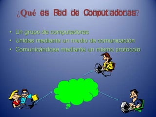 Una red de computadoras es un grupo de computadoras unidas mediante un medio de comunicación y que se comunican usando el mismo protocolo. Internet es un conjunto de estas redes interconectadas que permiten actividades como videoconferencias, ver imágenes por satélite, descargar películas o música y buscar información. Para acceder a Internet se necesita una computadora, tarjeta de red, modem, proveedor de servicios de Internet y un programa de navegación. Los principales servicios de Internet incluyen correo electrónico, páginas web y listas
