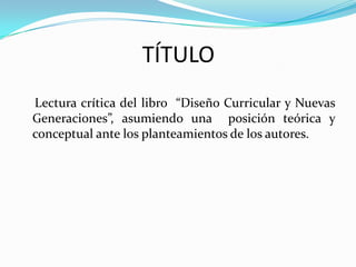 Este documento resume un libro sobre diseño curricular para las nuevas generaciones. Presenta el grupo de autores, el título del libro e introduce el tema. Describe que cada capítulo analiza un aspecto diferente como los contextos históricos y tecnológicos, la educación de la Generación Y, el currículo y las estrategias de enseñanza. La idea principal es que el libro busca aportar bibliografía y criterios para mejorar el diseño curricular y la enseñanza para las nuevas generaciones en el contexto de los cambios tecnoló