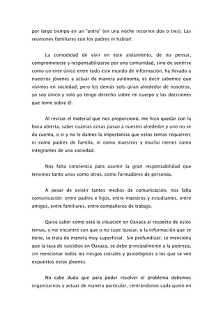 Este documento discute cómo la búsqueda de libertad ha llevado a un mayor aislamiento y comportamientos individualistas entre los jóvenes. También sugiere que la falta de comunicación entre padres e hijos, maestros y estudiantes ha contribuido a problemas sociales y psicológicos. Finalmente, argumenta que se necesita un enfoque más integral que involucre a las familias, escuelas, autoridades y profesionales para abordar estos temas y promover valores universales.