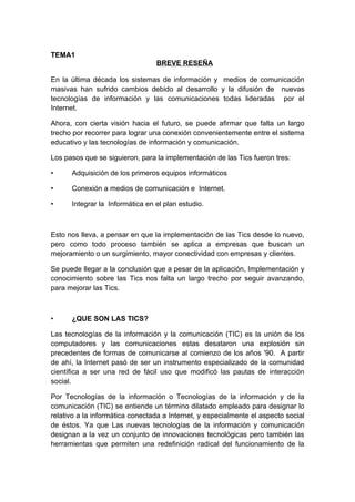 El documento describe las tecnologías de la información y la comunicación (TIC) y su importancia para las organizaciones. Explica que las TIC han cambiado los sistemas de información y medios de comunicación debido al desarrollo de Internet y nuevas tecnologías. También destaca que a pesar del progreso, queda mucho por avanzar en conectar el sistema educativo con las TIC. Finalmente, resalta que las TIC pueden ayudar a las pequeñas y medianas empresas a crecer al mejorar la eficiencia, reducir costos y