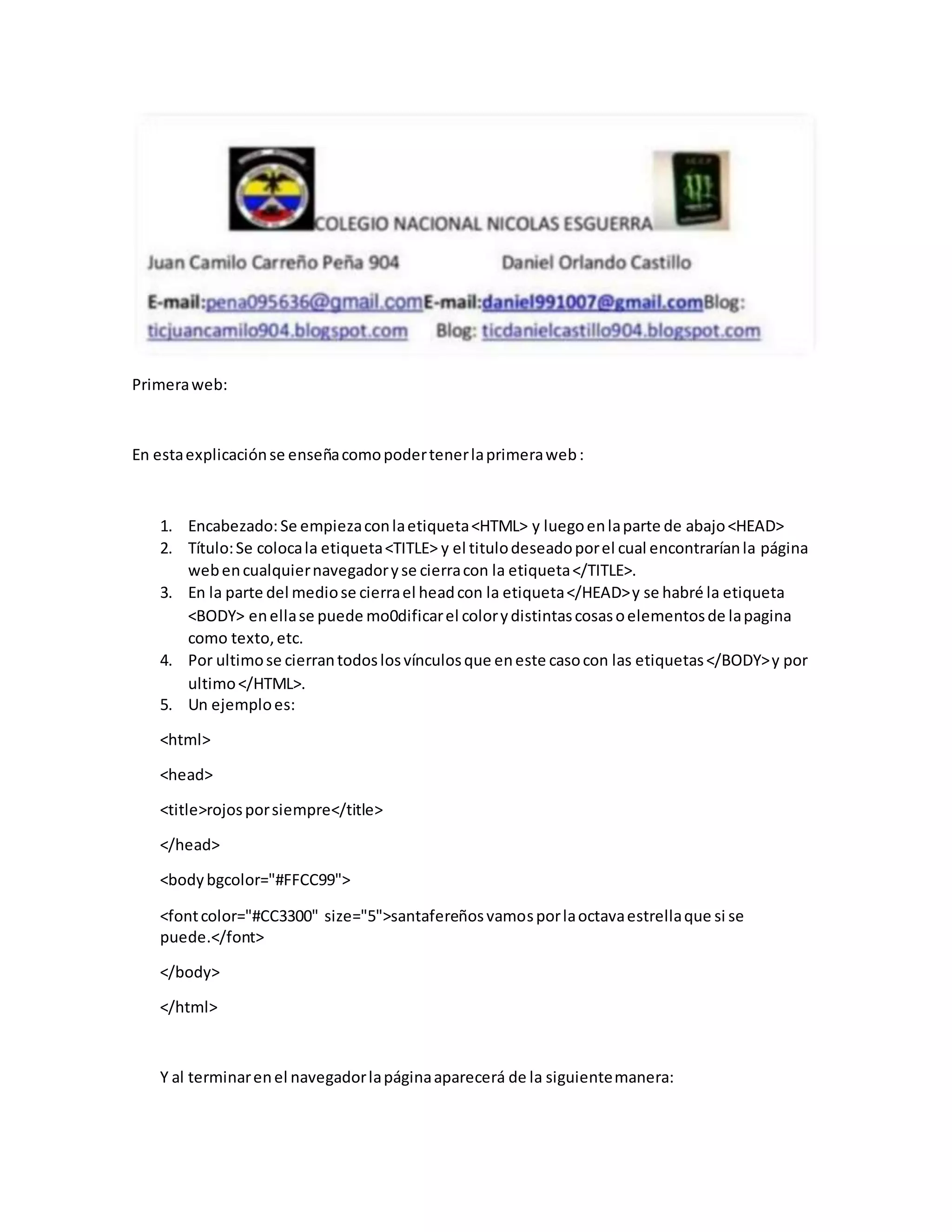 El documento explica los pasos para crear una página web básica utilizando etiquetas HTML, incluyendo encabezados, títulos, cuerpo y colores, y proporciona un ejemplo de código HTML para una página con color de fondo naranja y texto rojo que dice "santafereños vamos por la octava estrella que si se puede".