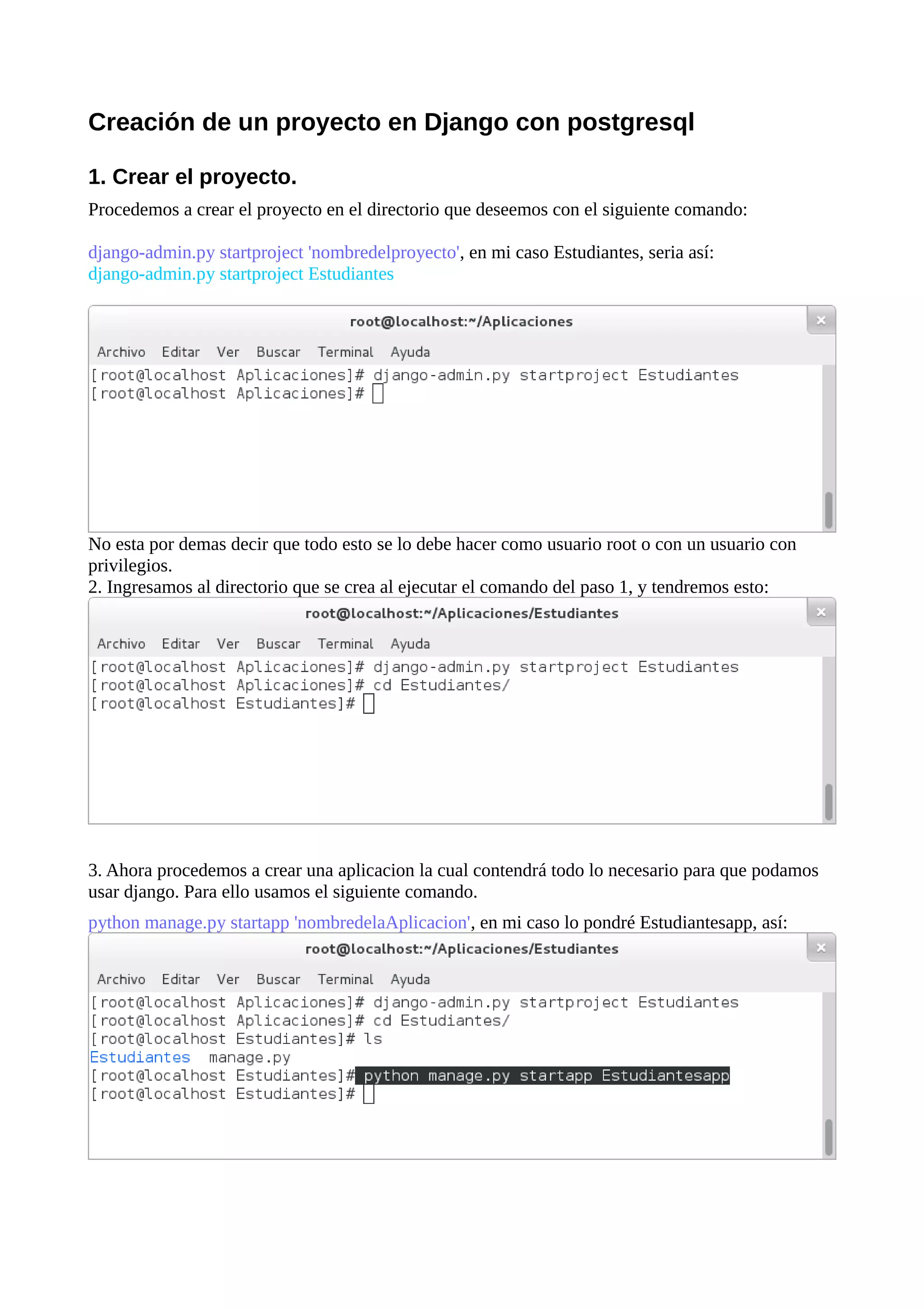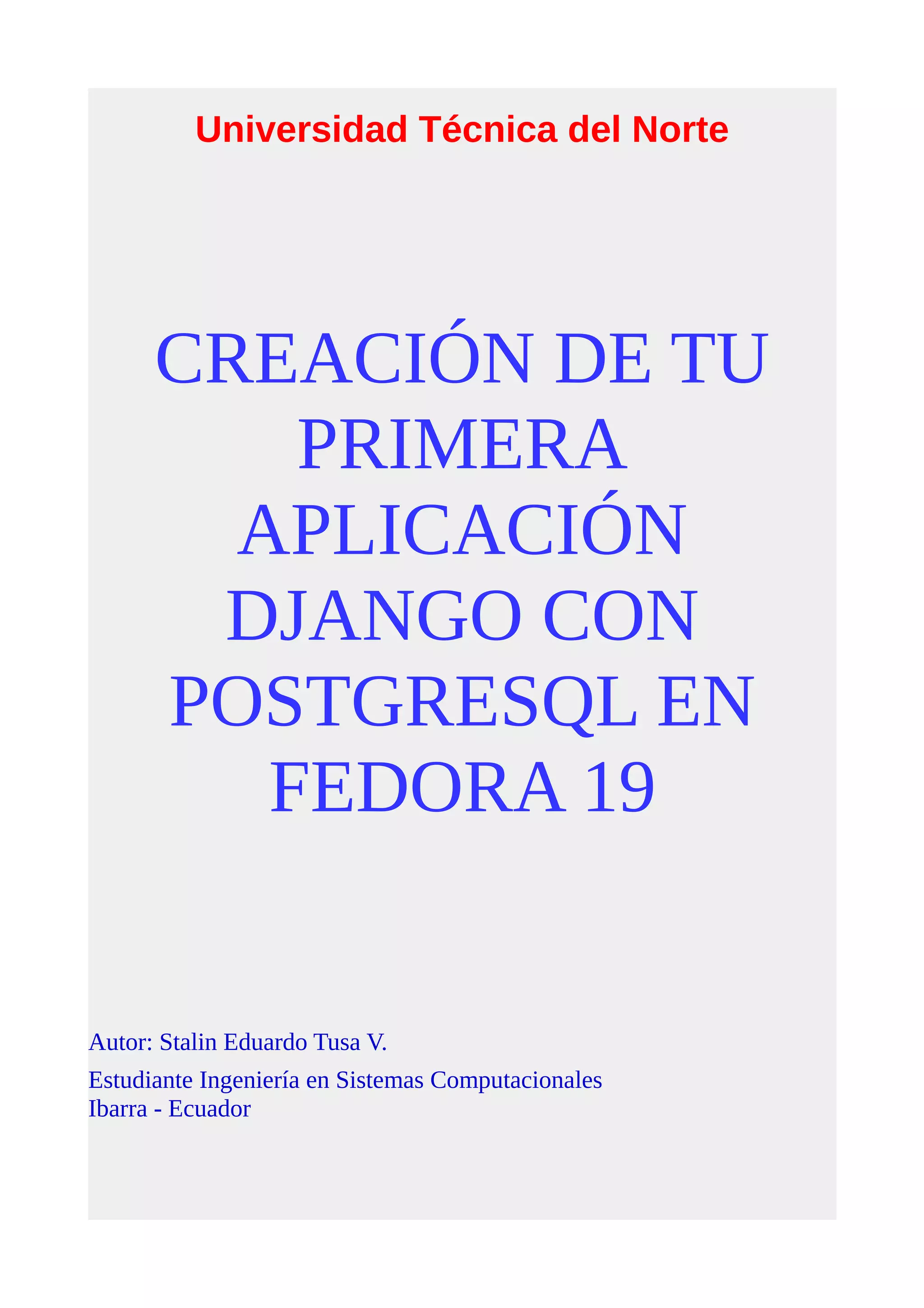 El documento es una guía para crear una aplicación Django con PostgreSQL en Fedora 19, explicando desde la creación del proyecto hasta la conexión con la base de datos. Incluye instrucciones sobre la configuración del archivo settings.py, instalación del driver de conexión y la ejecución del servidor. Finalmente, se detalla el proceso para registrar las tablas en la interfaz administrativa de Django mediante el archivo admin.py.