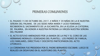 El 15 de octubre de 2017, 43 niños de la Escuela Nuestra Señora del Palmar recibieron la Primera Comunión en la Catedral de Palmira. La ceremonia fue presidida por el Padre Bernardo Escobar y contó con la participación de padres, familiares, directivas y docentes. Luego se realizó un desayuno en el auditorio de la escuela donde los niños compartieron con sus familias.