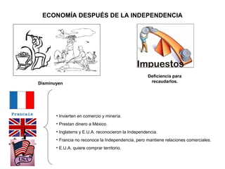El documento aborda los primeros años de vida independiente de México (1821-1850), destacando la inestabilidad política con más de 20 presidentes y conflictos con Estados Unidos, incluyendo la pérdida de Texas y la guerra que resultó en el Tratado de Guadalupe Hidalgo. Se mencionan los intentos de establecer un gobierno y la economía estancada, así como las relaciones con potencias extranjeras como Inglaterra y Estados Unidos. La situación resultó en un gran descontento y caos político tras la pérdida de casi la mitad del territorio nacional.