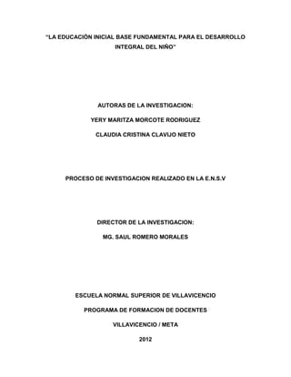 Este documento trata sobre la importancia de la educación inicial para el desarrollo integral del niño. Presenta como autoras a Yery Maritza Morcote Rodríguez y Claudia Cristina Clavijo Nieto, quienes realizaron esta investigación como parte de su formación docente en la Escuela Normal Superior de Villavicencio en el año 2012 bajo la dirección del Mg. Saúl Romero. El objetivo fue analizar el impacto que tiene la educación inicial recibida por los niños en su desarrollo cognitivo, emocional y social, y
