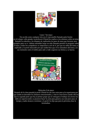 El documento describe dos días en la escuela primaria Valle Grande. El lunes, la profesora Ullenid explicó el tema de la cohesión a los estudiantes y les asignó un trabajo. Un estudiante llamado Pertulio hizo una pregunta sobre el tema y los otros estudiantes se rieron de él. El miércoles, la profesora Ullenid les dio a los estudiantes una carta desordenada para organizar y dijo que el primer grupo en entregar el trabajo correctamente recibiría una calificación superior, pero el tiempo se agotó