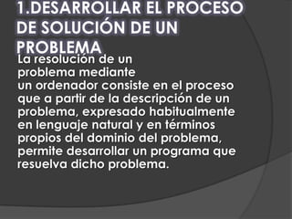 El documento describe las etapas del proceso de resolución de problemas con una computadora: 1) identificar el problema, 2) analizar el problema, 3) elaborar algoritmos de la solución, 4) elaborar diagramas de flujo de la solución, 5) crear pseudocódigo de la solución, y 6) probar la solución. Explica que la identificación del problema implica definirlo claramente y el análisis consiste en entenderlo a profundidad.