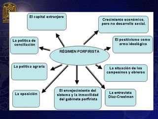 Durante el régimen porfirista de México hubo un fuerte crecimiento económico impulsado por la inversión extranjera en industrias extractivas y de transformación. Se expandió la red de ferrocarriles y puertos y se desarrolló el sistema bancario. Sin embargo, el costo social fue alto, con los ricos enriqueciéndose mucho y los pobres, especialmente los indígenas del sector rural, empobreciéndose todavía más bajo la dictadura de Porfirio Díaz.