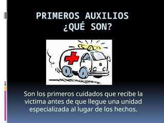 Los primeros auxilios son los cuidados iniciales que recibe una víctima antes de la llegada de personal especializado, con el objetivo de evitar agravamientos en su estado. Se diferencian entre urgencias, donde no hay riesgo inmediato de muerte, y emergencias, que requieren atención inmediata. El manejo de la escena y la correcta actuación para detener hemorragias y movilizar lesionados son fundamentales en estos primeros auxilios.